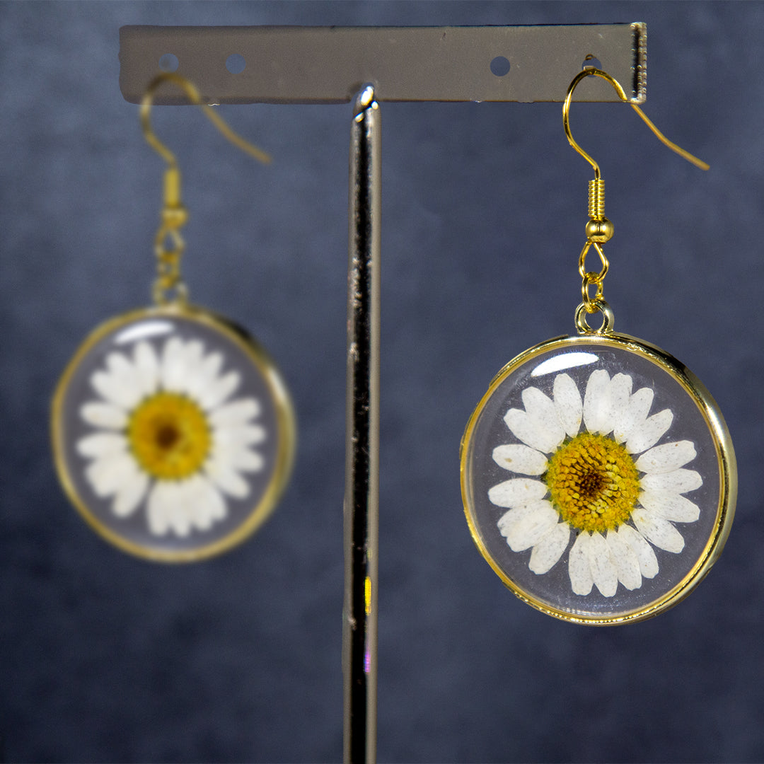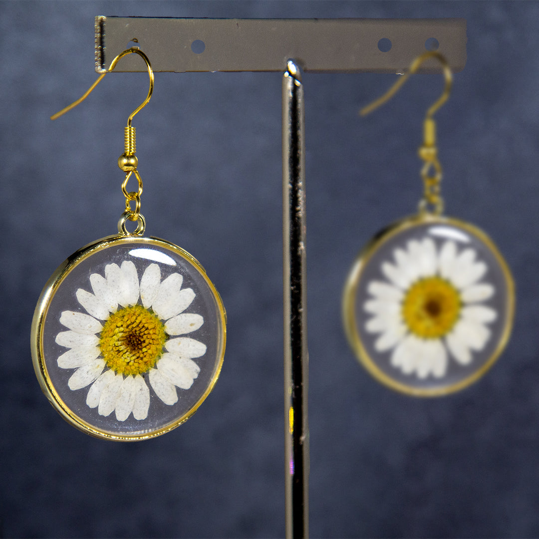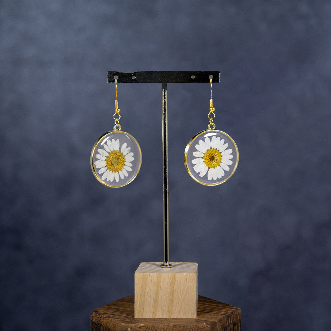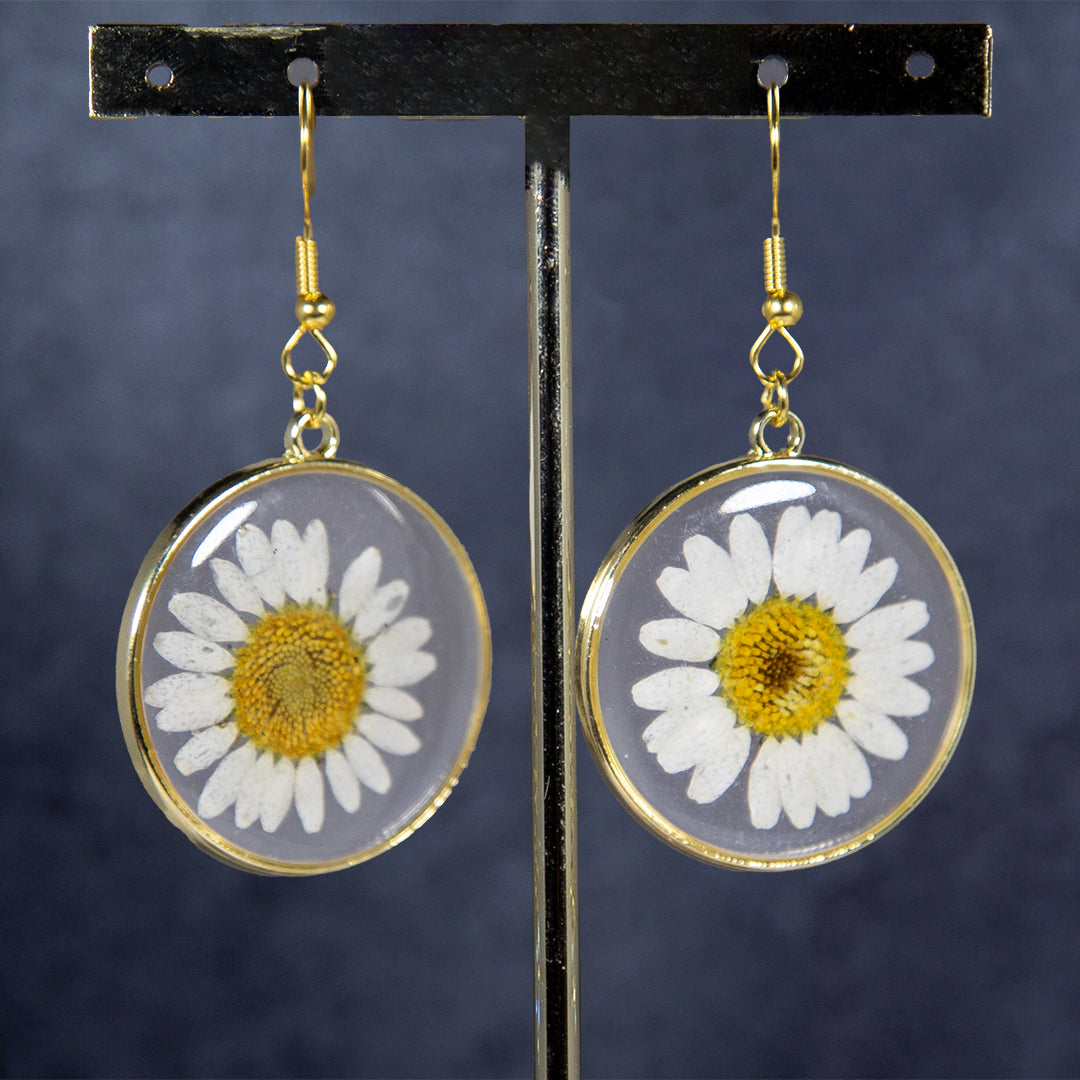 Each earring features a real pressed daisy delicately preserved in resin, capturing the essence of a blooming flower frozen in time.The resin-encased daisies ensure that their beauty remains eternal, bringing a touch of nature-inspired elegance to every occasion.