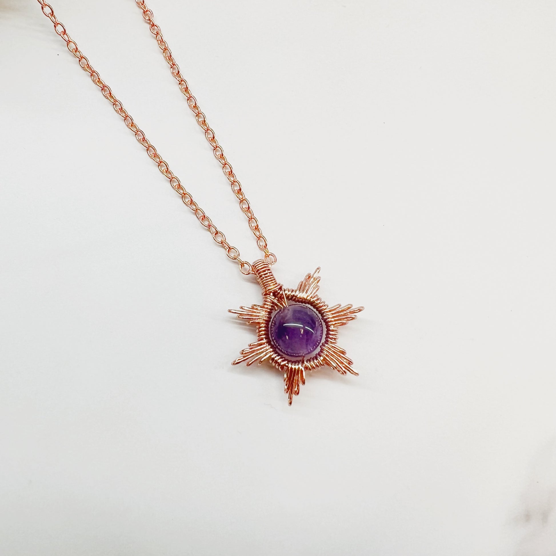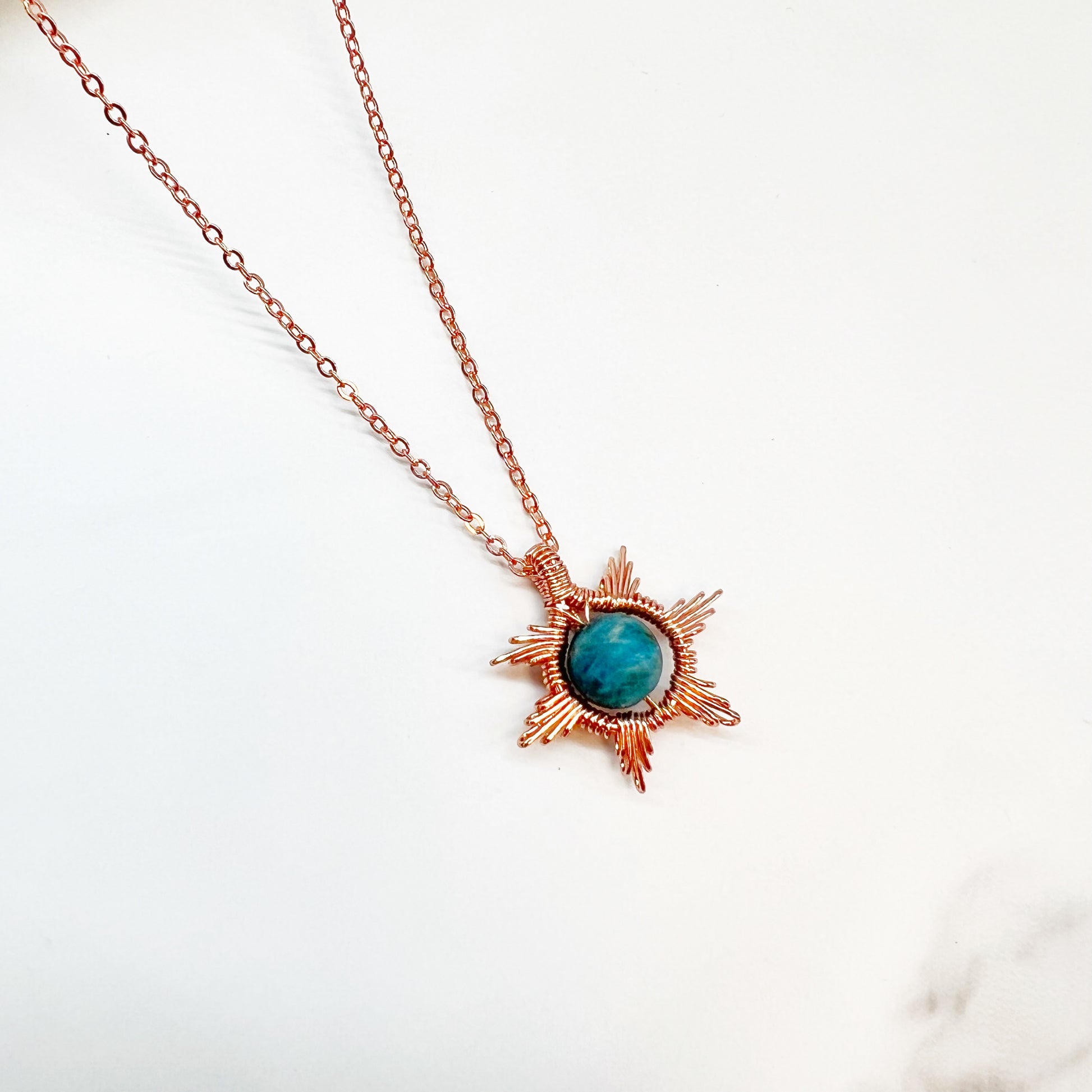 Embrace the warm and captivating allure of the sun with this exquisite necklace. The wire-wrapped design beautifully captures the essence of a rising sun, radiating positivity and vitality. At the heart of this necklace, you'll find a gemstone that adds a touch of natural beauty and color. Choose from an array of gemstones, each with its unique charm and energy. Choose your favorite gemstone, and let the sun's energy shine through you. Wear it with grace, and let its warmth brighten your day.