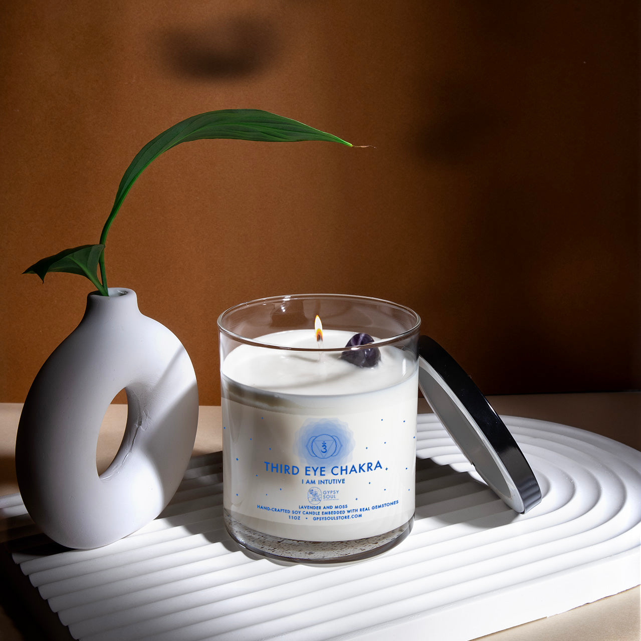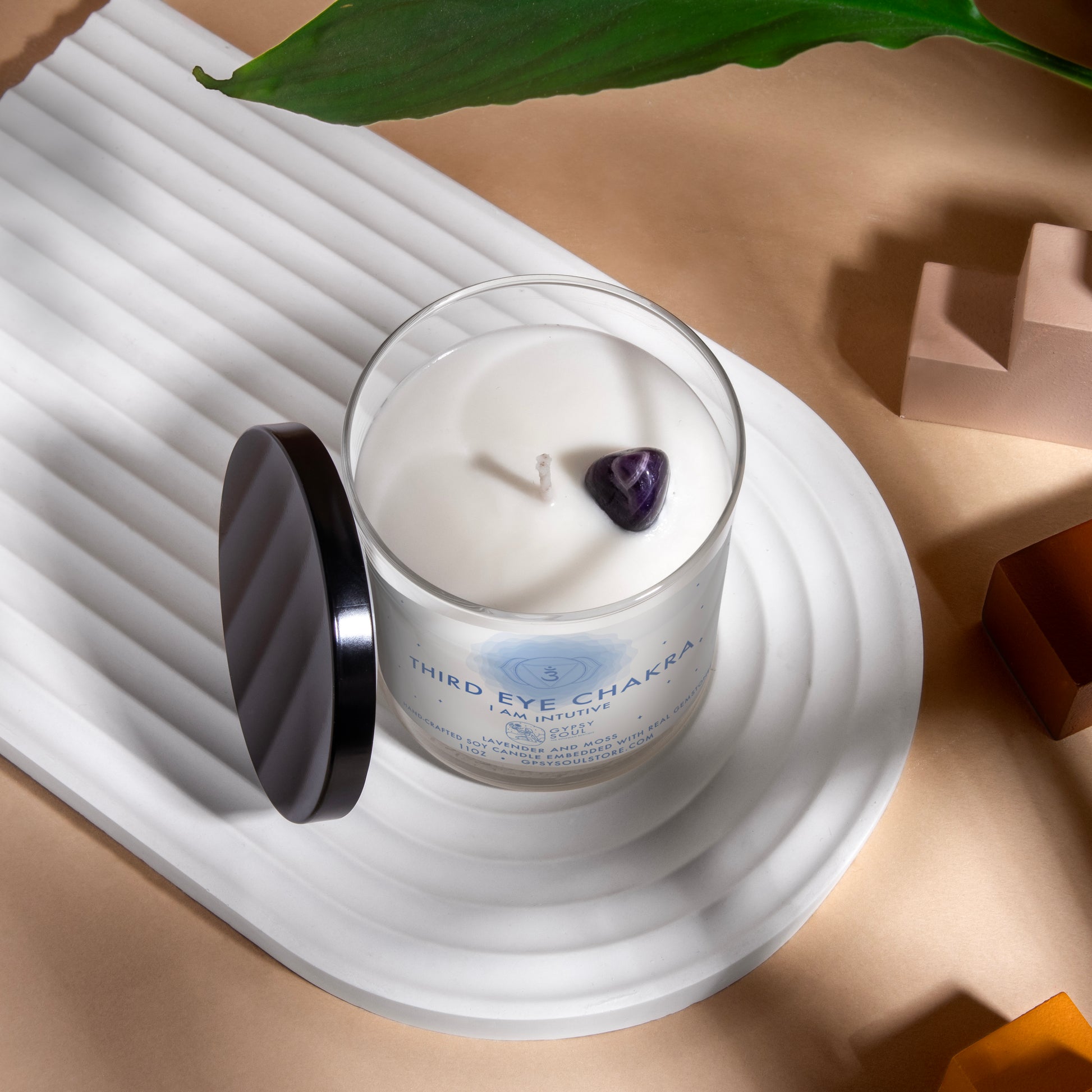 We are inspired by delicate notes of lavender to bring this candle to you. Additionally, there are Amethyst tumbled crystals inside connected with this chakra.